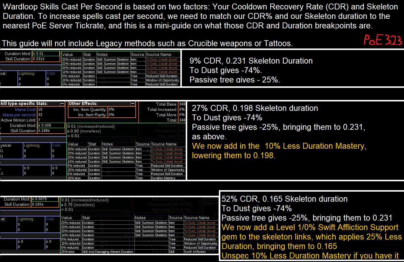 With Ynda belt, you are looking to adjust your build for a cooldown recovery rate of 9% and a skeleton duration of 0.231 second. Problem 1 : your cooldown recovery rate is 7% (your boot implicit). It's not enought. - Solution : Find an abyss jewel with the mod "2% increased cooldown recovery rate" With the boots, the total will be 9% Trade link for Keeper league : https://www.pathofexile.com/trade/search/Keepers/5n8jvRyJSa. If you get a 3% it's the same, just more expensive. - Alternative Solution : Get a boot with 9% implicit (if you're rich) Problem 2 : You skeleton duration is 0.528 second instead of 0.231 second. - Solution : First remove your Less Duration support. Not only is it not needed, it's forbidden with a 9% cdr loop. Then you need to get 99% reduced duration for your skeletons. Right now, you have 95% with 5 To Dust. Either replace your 15% To Dust with a 19%, or use 4 To Dust for 74% and add 25% with the passive tree (next to Magebane keystone). Again, check https://cwdt.info/img/cdr1.png Problem 3 : Your Olorth's flask fail the test : https://cwdt.info/calculator - Solution : Increase flask gained from 65% to at least 82%. - Alternate Solution : Get the "flasks gain a charge every 3 seconds" searing exarch implicit on your body armour and increase flask gained from 65% to at least 67%. No, you flask implicit while in presence of unique isn't worth anything. ######### TLDR Here an edited version of your buid : https://pobb.in/II_bmOVMvYLa Edits : - Removed Less Duration Support - Changed To Dust 15% to 19% - Added an abyss Jewel with 2% increased cdr - Removed 2 skill points (Annihilation Notable and spell critical chance small passive) - Invested 2 skill points into 20% flask charge gained (above Traitor Keystone) Make sure your Networking Mode in the Game Options at character selection screen is "Lockstep" Our civilization rose so much through the mind that it sometimes becomes difficult to reincarnate our own bodies.