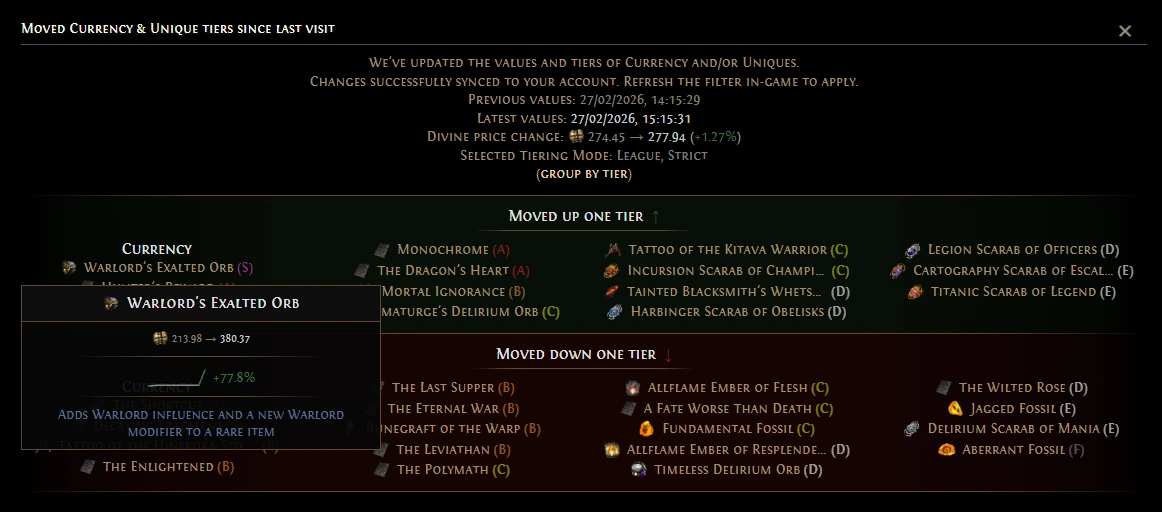 ![]() PoE1 v1.1: Automatic Economy Updates, Custom Tiering Modes, All Economies, Identified Item Configurations, Simulator v1.1.143 - 27/02/2026 We're excited to announce v1.1 of PoE1 Filter, introducing several improvements to the economy tiering, Identified Item Configurations, and much more! Automatic Economy Updates We've finally introduced the long awaited automatic updates of Economy data. The value of all Currency items, Uniques and Cluster Jewels is now updated every hour. Upon revisiting the tool, you'll be greated with an overview of which Currencies and Uniques moved up or down one or more tiers. You can now also group the items by their new tier instead. If you keep the tool open, every hour, you'll automatically receive the latest data. If you're logged in on pathofexile.com, your filter will even automatically synchronize to your account! All you still have to do is refresh ingame. You can configure this behaviour in detail on the Settings page. We now also keep track of the price history of all items. Hover over any item on the Changelog page or the Tier Lists to see their price evolution, and how much the price increased or decreased since the last update. Custom Tiering Mode Another request we received frequently was the ability to set custom 'cutoff points' for the Drop Tiers. We're happy to introduce this as well! Select the 'Custom' Currency or Unique Tiering Mode, and click the 'Configure' button to fine-tune the cutoff values. You can even select the 'base currency', e.g. 'any item worth at least 2 divines'. Notice that we also (re-) introduced Unique Tiering Modes, with 3 tiers by default: Normal, Strict, and Very Strict; so that off the shelf, you can now choose to display only the most valuable uniques. All Economies Hardcore & Standard players, we've got you covered! You can now select the economy you play in (on a per-filter basis), and we'll use that economy's live data. You can select your economy on the 'Presets' tab, or under the 'Currency' Quick Filters section. Improved Fixed (SSF) Economy data We've also improved support for SSF player! If you don't care about economy data or the latest meta updates, you can select the 'Fixed' economy, which uses hard-coded values for all Currencies and Uniques. Do double-check whether all your chase Uniques are in the right tiers though. We're very much open to suggestions on how to improve these! Drop by on our Discord and we'll get you started. Now that 'Fixed' is no longer a separate 'Tiering Mode' but its own 'Economy', this means that, while using the Fixed Economy, you can now also set an Early/Normal/Strict/Very Strict Tiering Mode. Identified Item Configurations, Magic Items, Perfect Mod Tier Instead of the predefined 'Excellent' and 'Good' configurations, with predefined, fixed mod requirements, we've introduced a variable number of 'Configurations'. By default, the filter will use the same ones as before for Rare items, but add Configurations for Magic items as well. For instance, the 'Excellent Rare Equipment' Configuration detects items which have at least 4 Good+ mods, of which 1 Great+ Prefix and one Great+ Suffix; and no Bad mods. Not happy with these default requirements? Change them! Need more Configurations? Create your own! We also introduced a third Mod Tier: 'Perfect'. In the default Configurations this is only used for Magic items; ideal to serve as Crafting Bases, or to use in the Recombinator. Item Simulator Were you ever unsure why a certain item got shown or hidden? We've got you covered! While ingame, hover over the item and press CTRL+C (or CTRL+ALT+C for more details). Then, anywhere in the tool, press CTRL+V to see if and how it would show up, and which rules affect it (You'll need to click 'Allow' when your browser asks to share your clipboard). You can then immediately jump to the rule to change it, or to the filter output to see the generated rule in context. As you change your filter settings, you'll see the effect on the item in real-time. This feature also allows price-checking Unique items: copy/paste a unique item to see its price; or copy/paste an unidentified Unique Base Type to see the list of possible Uniques and their values. For identified items, press CTRL+ALT+C ingame to accurately interpret all mods on the item. Moved to Cloudflare host Up until now, PoE1 Filter was hosted on a 'hobby-grade' LAMP server -- it did start as an experimental hobby project after all. Although it held up remarkedly well (undoubtedly due to its extremely light-weight architecture, it was time to change. Moving to Cloudflare should offer best-in-class speed & protection, and it allows us to easily run background jobs. As an occasional reminder, if you want to chip in with the hosting costs or just want to support the project, you can buy me a coffee here! Other Changes - When you try to sync a filter which contains an error, the error message received back from GGG is now displayed behind an error icon. - The 'Gold Style Override' now makes Gold transparent. This will be applied for new filters. To apply this style to an existing filter, enable it from the Presets tab. - Disallow hiding an Item Tier through the Item Tier List tab. - Added a 'Reset Changed Tiers' button per Tier List tab. - Gold Stacks will never play an Alert sound, so that when immediately picking it up, you're not left wondering what it was that made the sound. - On the Mod Tier List tab, 'Show all unassigned' will now be enabled automatically when selecting any of the Jewel tabs. Also, the search field will remain active when enabled, on all tabs (thanks mcswayer). - Removed the 'Hide all remaining gear' checkbox from the End-Game Content section on the Presets tab since it is presumably never disabled and only possibly confusing. - Added rule names for Custom (Cosmetic) Rules, and improved the rule names for My Equipment. - You can now also navigate to & from the Filter Output for My Equipment rules, by CTRL+clicking on the tit