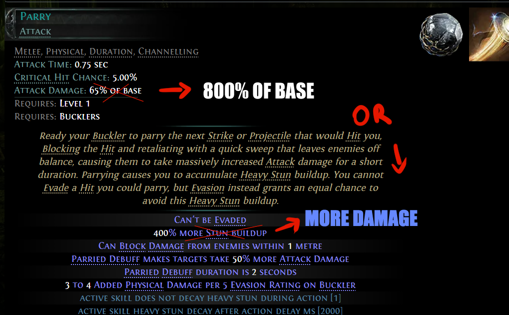 It's usable to shuffle red and green gems to change crystalline immunity if the map has ignited or shocked ground (or doing the jump&run trial vs traps). It's just a free skill that would never be slotted but can hold various support gems. It provides no benefits, 1m is too low range and most 'interesting' attacks cannot be blocked... I mean, parried. Bucklers themselves are subpar to shields and scepters (both lower damage, and defenses), no usable uniques either. At the least bucklers should come in with 30% deflection right off the hop. Dernière édition par bestsss#7863, le 28 sept. 2025 à 07:50:40
