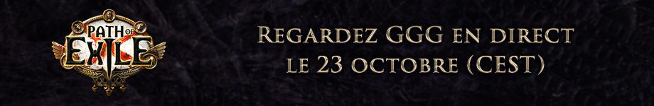 GGG en direct GGG en direct commencera le 23 octobre à 21 heures (CEST) sur twitch.tv/pathofexile ! Le stream d’annonce en direct vous dévoilera tout ce qu’il y a à savoir sur l’extension 3.27 de Path of Exile, sa ligue de défis et le contenu qu’elle apporte. Une fois le stream d’annonce achevé, Mark et Jonathan répondront à toutes vos questions dans le cadre d’une session de Q&R. De nouveaux Twitch drops seront activés pendant le stream d’annonce. Les détails à ce sujet seront annoncés en début de semaine prochaine. Le co-streaming est comme toujours le bienvenu ! Date de sortie de l’extension 3.27 de Path of Exile Brandissez la Flamme et repoussez l’engeance des ruches ! Vous pourrez jouer à Keepers of the Flame gratuitement sur PC et consoles le 31 octobre (CET). À la prochaine ! |