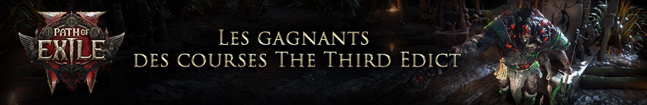 Tous les gagnants de ces courses remportent l’objet unique Vertu du Demi-dieu, tandis que le meilleur du classement de chacune des classes sur l’ensemble des courses remporte en plus un Displate officiel de Path of Exile 2 de leur choix. Félicitations aux joueurs les plus rapides sur l’ensemble de ces trois courses ! En plus des récompenses ci-dessus, ils remportent également une conception de Carte divinatoire. Première place pour chaque classe Gagnants de la première course Gagnants de la deuxième course Gagnants de la troisième course Merci encore à tous pour votre participation à cet Évènement The Third Edict. Nous sommes actuellement en train de remettre aux gagnants leurs prix. Ceux qui ont remporté un Displate officiel Path of Exile 2 ainsi que tous ceux qui souhaitent s’en procurer un peuvent consulter le catalogue en cliquant ici ![]() |