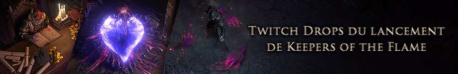 Twitch DropsAfin de célébrer le lancement de Path of Exile: Keepers of the Flame, nous organisons deux semaines de Twitch Drops à compter du 31 octobre à 20h CET !Twitch Drops de la semaine 1 - Décoration de Repaire : Trésorier + Effet de personnage : Griffe de Seigneur de BrècheDébut : le 31 octobre à 20h CET (soit oct. 31, 2025 3:00 PM (UTC−4) dans votre fuseau horaire) Fin : le 8 novembre à 11h59 CET (soit nov. 08, 2025 5:59 AM (UTC−5) dans votre fuseau horaire) Vous recevrez votre Décoration de Repaire : Trésorier et Effet de personnage : Griffe de Seigneur de Brèche après avoir accumulé 3 heures de visionnage sur n'importe quelle chaîne de la catégorie Path of Exile pendant la première semaine du lancement. Twitch Drops de la semaine 2 - Effet de mise à mort rare : Fracas de XeshtDébut : le 8 novembre à 12h00 CET (soit nov. 08, 2025 6:00 AM (UTC−5) dans votre fuseau horaire) Fin : le 16 novembre à 11h59 CET (soit nov. 16, 2025 5:59 AM (UTC−5) dans votre fuseau horaire) Vous recevrez votre Effet de mise à mort rare : Fraxas de Xesht après avoir accumulé 3 heures de visionnage sur n'importe quelle chaîne de la catégorie Path of Exile pendant la deuxième semaine du lancement. Les drops sont garantis pour tous ceux qui auront regardé un ou plusieurs streams de Path of Exile pendant la durée susmentionnée. Cette offre est disponible pour tous les comptes. Soutien un streamerAfin de soutenir les streamers de notre communauté, nous offrirons également l'Effet de Portail de l'Incarnation de la Terreur à tous ceux qui achèteront ou offriront 2 abonnements Twitch de n'importe quel niveau pendant la période allant du 31 octobre à 20h CET au 16 novembre à 11h59 CET. Pour participer :