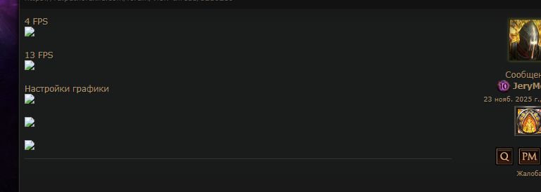 resolution_width=1899 adapter_name=NVIDIA GeForce RTX 3060 - SSN-24 fullscreen=false borderless_windowed_fullscreen=false background_framerate_limit=15 background_framerate_limit_enabled=true depth_of_field=false bloom_strength=0.25 vsync=Adaptive directx_version=auto dx12_antialias_mode=0 camera_zrotation=true max_VS_shader_model=vs_vkn dx11_antialias_mode=0 screenspace_effects=2 use_dynamic_particle_culling=true dx9_antialias_mode=0 screenspace_effects_resolution=1 dynamic_resolution_fps=30 time_manipulation_effects=true quality=true framerate_limit=75 framerate_limit_enabled=true global_illumination_detail=0 incursion_effect=false use_dynamic_resolution=true light_quality=1 vulkan_antialias_mode=1 max_PS_shader_model=ps_vkn maximize_window=false texture_quality=TextureQualityHigh renderer_type=DirectX12 resolution_height=789 upscale_resolution=UltraQuality screen_shake_v2=false shadow_type=High adapter_uid=00000000-0000f0e3-00 texture_filtering=4 water_detail=1 triple_buffering=true upscale=DLSS upscale_sharpness=0.752 upscale_quality=Quality upscale_quality_xess=Quality device_type=DirectX12 железо: AMD Ryzen 5 3600, 4142 MHz Gigabyte B450 Aorus Elite V2 32гб памяти на 3200 частоте nVIDIA GeForce RTX 3060 какой-то там ssd Microsoft Windows 11 Pro (жалею, что перешел т.к. игры запускаются дольше в отличии от 10-ки) Выглядит дешевле твоего сетапа, но таких просадок у ЦП\ГП у меня нет. Пробовал рендеры менять? У меня до выхода пое2 в збт был вулкан, но после обновления перешел на directx 12 Проведи стандартные проверки целостности и удали старый кеш обязательно. ЧС для форума: https://ru.pathofexile.com/forum/view-thread/3216210 Dernière édition par aaimwhite#5408, le 23 nov. 2025 à 10:15:06