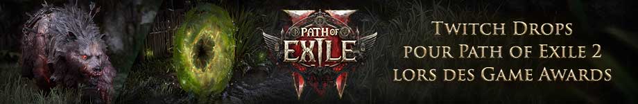 Portail des Druides des MajisPour remporter le Portail des Druides des Majis, il vous suffit de lier votre compte Path of Exile avec votre compte Twitch (voir ci-dessous) et de regarder la cérémonie des Game Awards le 12 décembre à 1 heure du matin (CET). Ce portail fonctionnera immédiatement dans Path of Exile 2 et sera disponible dans Path of Exile 1 à une date ultérieure.Début : 12 décembre à 1 heure (CET), ce qui correspond à la date suivante dans vos fuseaux horaires respectifs : (déc. 11, 2025 7:00 PM (UTC−5). Fin : 12 décembre à 5h30 (CET), ou bien : (déc. 11, 2025 11:30 PM (UTC−5). Vous obtiendrez le Portail des Druides des Majis après avoir regardé 30 minutes en cumulé n’importe quelle chaîne dont les Twitch Drops sont actifs et qui streame les Game Awards pendant la durée de cette offre. Cela signifie que cette microtransaction sera garantie pour tous ceux qui auront regardé n’importe quel stream diffusant les Game Awards pendant la durée requise. Cette offre est disponible sur PC et consoles Effet de Métamorphose de l’Ours de guerre aguerriSi vous soutenez votre streamer ou streameuse de prédilection par l’achat d’un abonnement Twitch de n’importe quel niveau pendant la cérémonie des Game Awards, vous recevrez l’Effet de Métamorphose de l’Ours de guerre aguerri ! Veuillez noter que cet effet cosmétique est uniquement disponible dans Path of Exile 2.Modalités de participation :