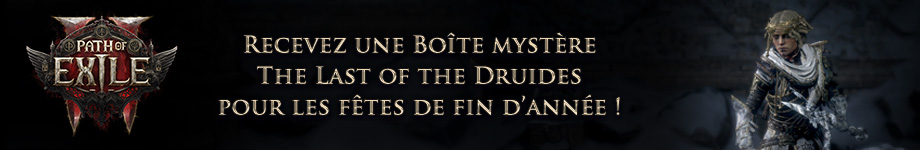 Comment recevoir votre cadeauPour recevoir votre Boîte mystère gratuite The Last of the Druids, il vous suffit d’ouvrir le menu de la boutique en jeu, que ce soit sur Path of Exile 1 ou 2 ! La Boîte mystère sera automatiquement ajoutée à votre compte et vous la trouverez dans votre Réserve de microtransactions. Veuillez noter qu’accéder à la boutique depuis le site web n’octroie pas cette Boîte mystère, vous devez accéder à la boutique avec le client du jeu. Notez également que bien que cette Boîte mystère ne soit pas accessible dans Path of Exile 1, vous la recevrez néanmoins et pourrez l’ouvrir lorsqu’elle sera disponible dans Path of Exile 1.Afin d’être éligible pour recevoir ce cadeau, votre compte devra avoir été créé avant aujourd’hui et vous ne pouvez obtenir qu’une seule fois cette Boîte mystère en tant que cadeau par compte. Cette offre est disponible sur PC, PlayStation et Xbox. Si vous possédez déjà tous les objets de la Boîte mystère The Last of the Druids, vous recevrez à la place deux Boîtes mystères de Boiscintillant. Vous pourrez obtenir cette Boîte mystère jusqu’à la date suivante, affichée dans vos fuseaux horaires respectifs : at janv. 08, 2026 5:59 AM (UTC−5). Pour découvrir le contenu de la Boîte mystère The Last of the Druids, regardez la bande-annonce ci-dessous ! Merci à tous pour votre soutien ! Nous espérons que vous passerez de merveilleuses fêtes de fin d’année ! |